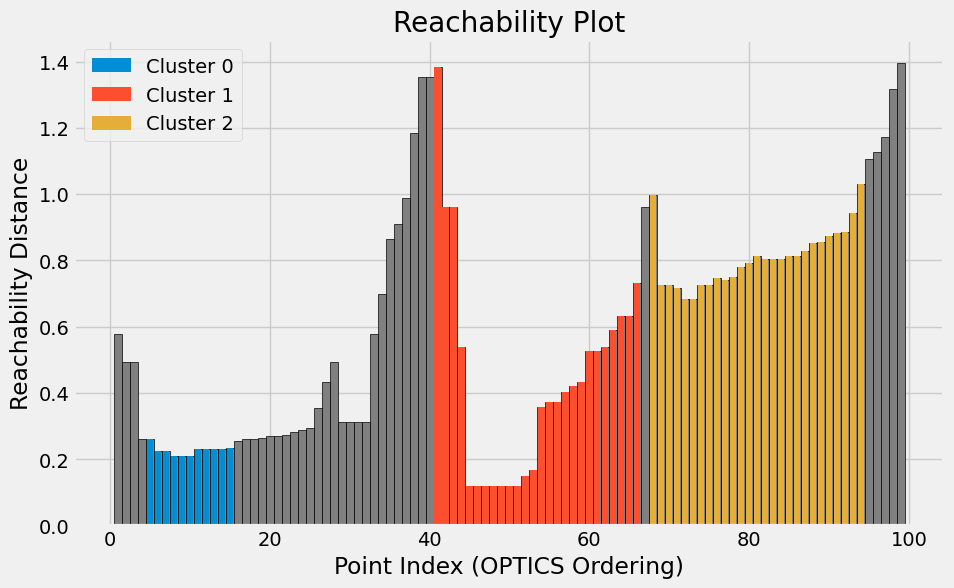 Similar to DBSCAN, but more flexible. Instead of fixing one density threshold, this explores clusters across a range of densities and produces a reachability plot.